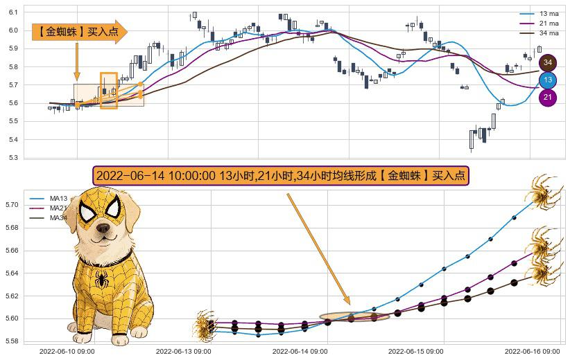 ⚀ 2022-06-14 10:00:00小时显现 13小时-21小时-34小时均线 【金蜘蛛】买入点 看多信号,后市看涨,买入