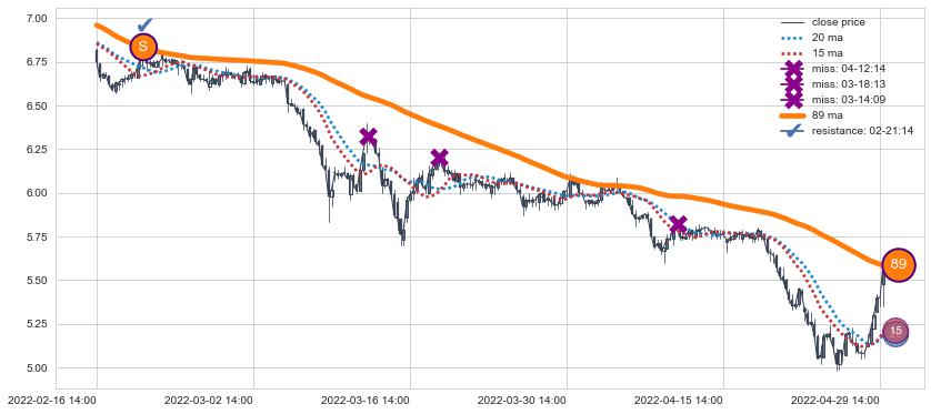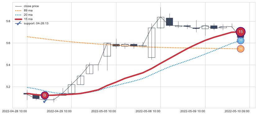 ⚂ 2022-06-14 09:00:00小时突然冒出一根大阳线,一下子顶穿三条均线且收盘价收在各条均线之上