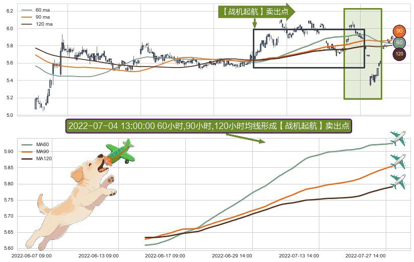 ⚀ 2022-06-14 13:00:00小时-2022-07-28 14:00:00小时显现 60小时-90小时-120小时均线 【战机起航】卖出点 看空信号,后市看跌,卖出