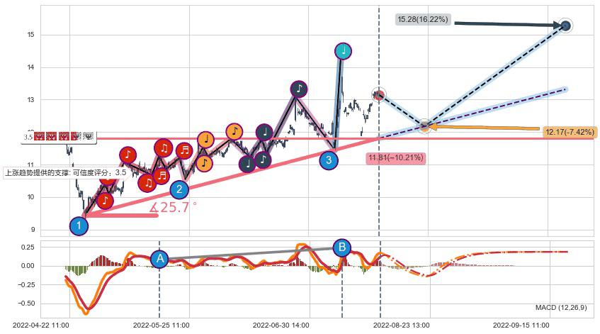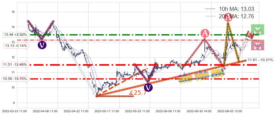 ♘ 阻力价格位13.48,可信任强度75.15%,距离最后交易2022-08-12 14:00形成的收盘价格13.15相差 +2.52%