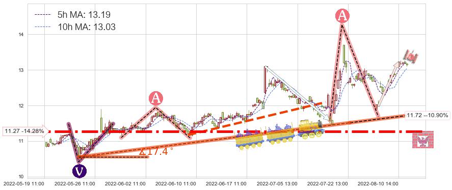 2022-06-14: 第一支撑位11.27有效抑制了下跌浪,成功阻止了价格的继续下跌。