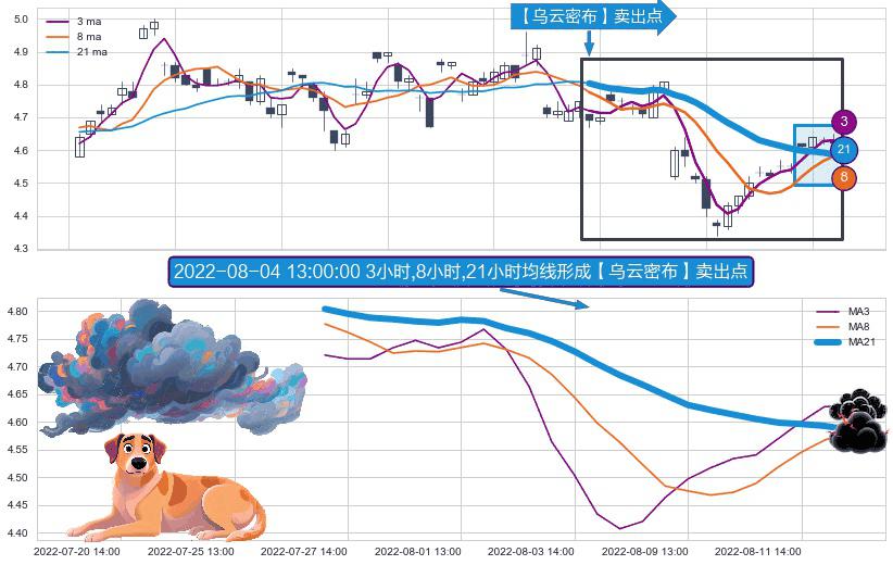 ⚀ 2022-07-27 13:00:00小时-2022-08-12 14:00:00小时显现 3小时-8小时-21小时均线 【乌云密布】卖出点 看空信号,后市看跌,卖出