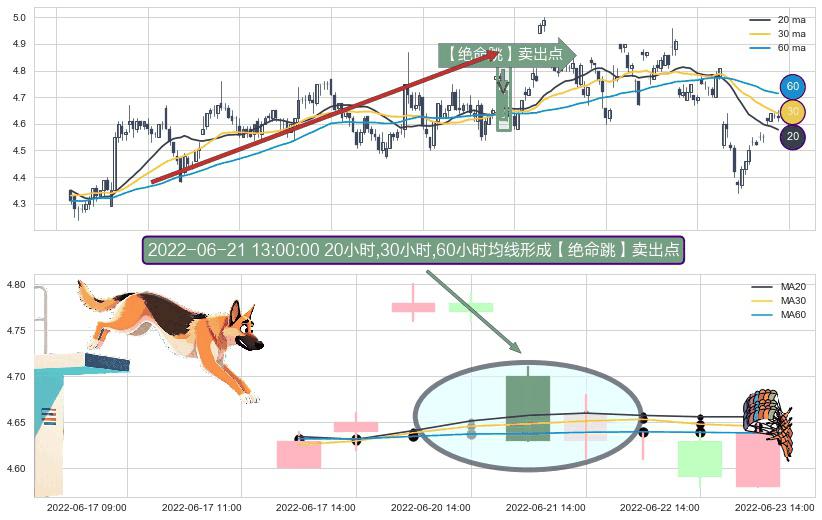 ⚀ 2022-06-21 13:00:00小时显现 20小时-30小时-60小时均线 【绝命跳】卖出点 看空信号,后市看跌,卖出