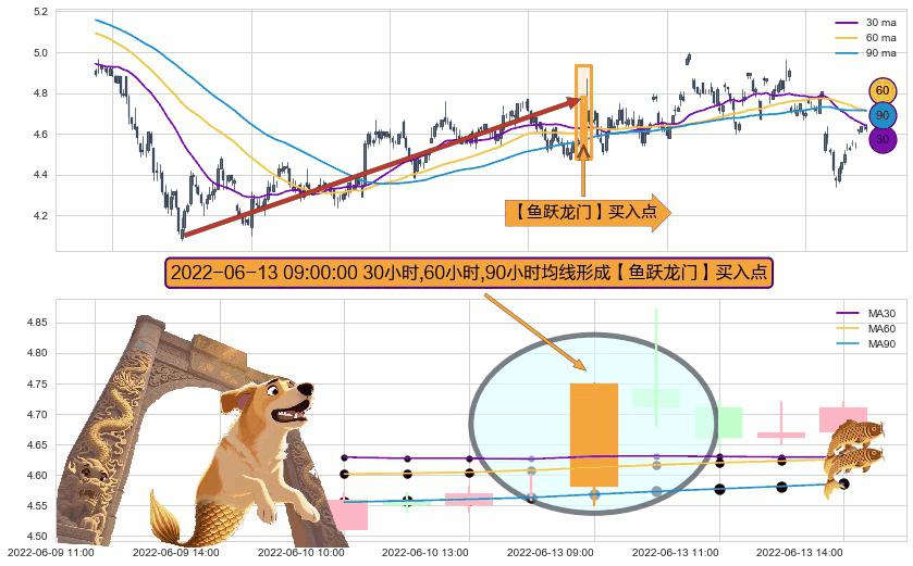 ⚀ 2022-06-13 09:00:00小时显现 30小时-60小时-90小时均线 【鱼跃龙门】买入点 看多信号,后市看涨,买入