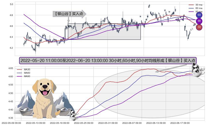 ⚀ 2022-05-20 13:00:00-小时至2022-06-20 13:00:00-小时显现 30小时-60小时-90小时均线 【银山谷】买入点 看多信号,后市看涨,买入