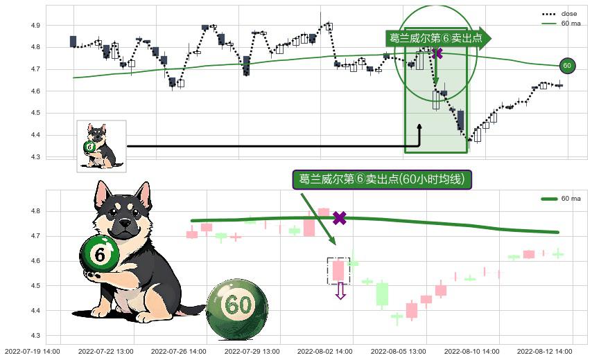 ⚀ 2022-08-02 13:00:00-小时显现 葛兰威尔均线 60小时均线 第⑥卖出点 走势反转见顶信号,后市看跌,卖出信号