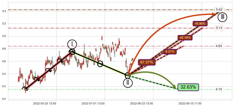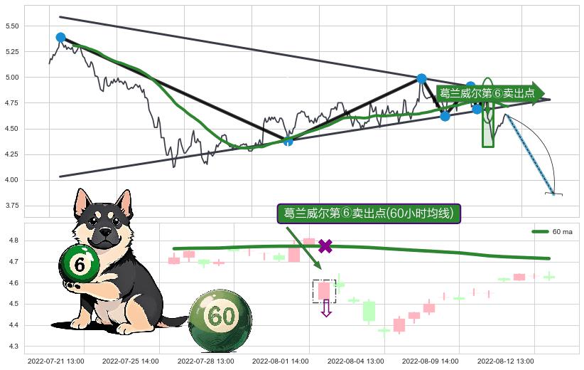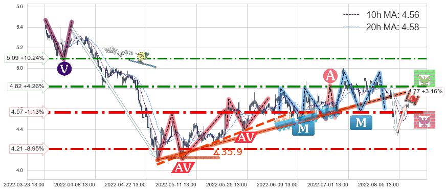 ♘ 阻力价格位4.82,可信任强度72.00%,距离最后交易2022-08-12 14:00形成的收盘价格4.62相差 +4.26%
