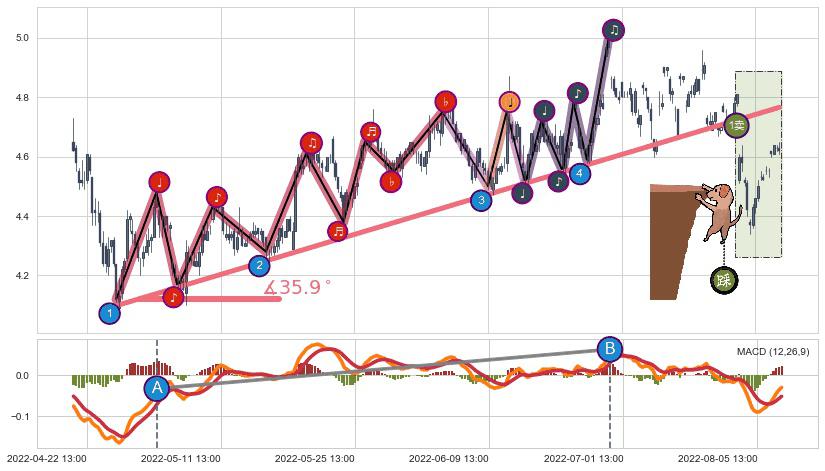 ✂️ 2022-04-26 14:00-2022-07-08 14:00上升趋势存在反转[风险],其原上升趋势的支撑位(4.77)已破位[强阻力信号],原上升趋势角度: 35.9˚