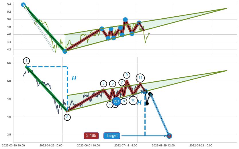 ➣ 【已确认突破】最后价格:4.62与最小【整理】第一目标价格→(08-25:09: 3.465 )相较: 下跌空间【较大】