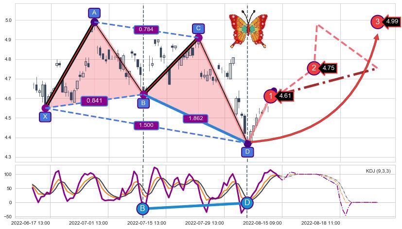 ➣ 已完成【蝴蝶】形态起点X: 06-17:10, 终点D: 08-04:13, 共71交易小时