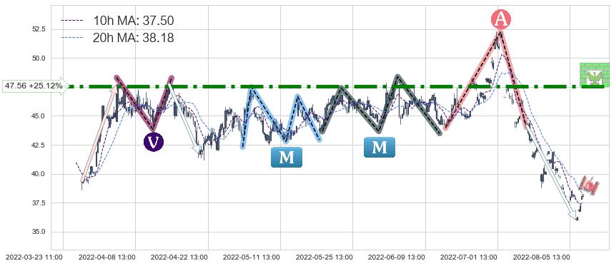2022-05-24: 第一阻力位47.56起到了持续的阻力作用,有效地促进了价格的回落。
