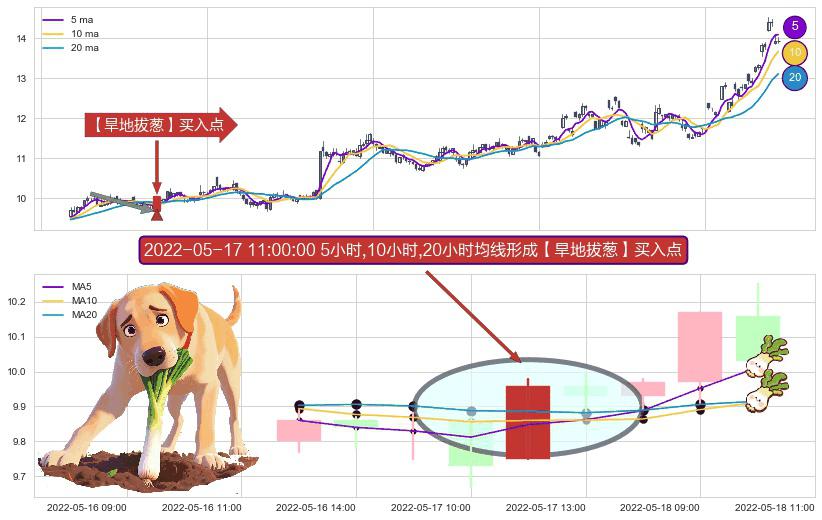 ⚀ 2022-05-17 11:00:00小时显现 5小时-10小时-20小时均线 【旱地拔葱】买入点 看多信号,后市看涨,买入
