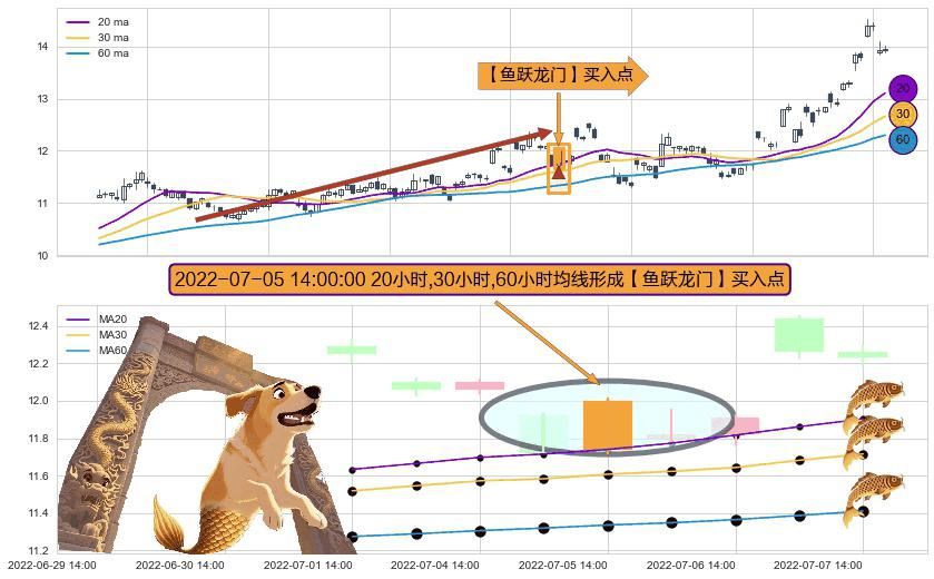 ⚀ 2022-07-05 14:00:00小时显现 20小时-30小时-60小时均线 【鱼跃龙门】买入点 看多信号,后市看涨,买入