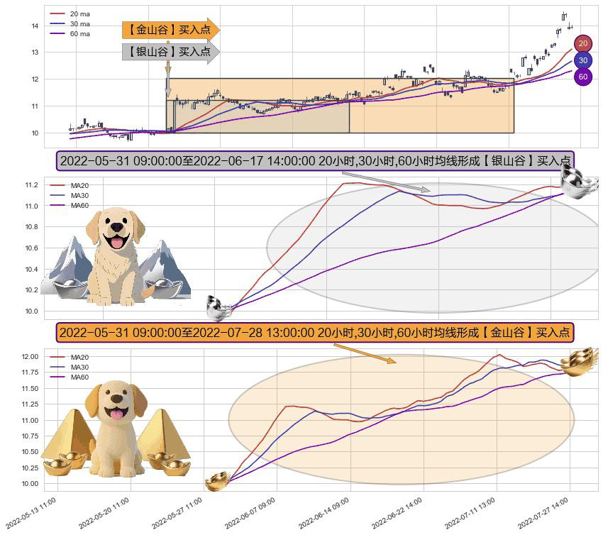 ⚃ 2022-05-31 10:00:00-小时至2022-07-28 13:00:00-小时显现 20小时-30小时-60小时均线 【金山谷】买入点 其再次确认了买入信号,可靠性更强,买入