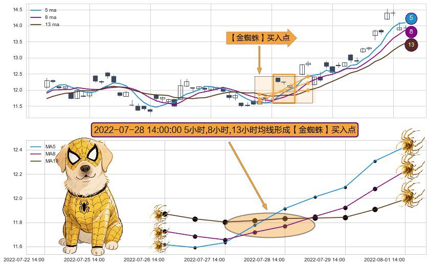 ⚀ 2022-07-28 14:00:00小时显现 5小时-8小时-13小时均线 【金蜘蛛】买入点 看多信号,后市看涨,买入
