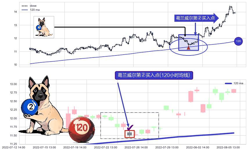 ⚀ 2022-07-25 13:00:00-小时显现 葛兰威尔均线 120小时均线 第②买入点 上升趋势的中继信号,后市看涨,买进信号