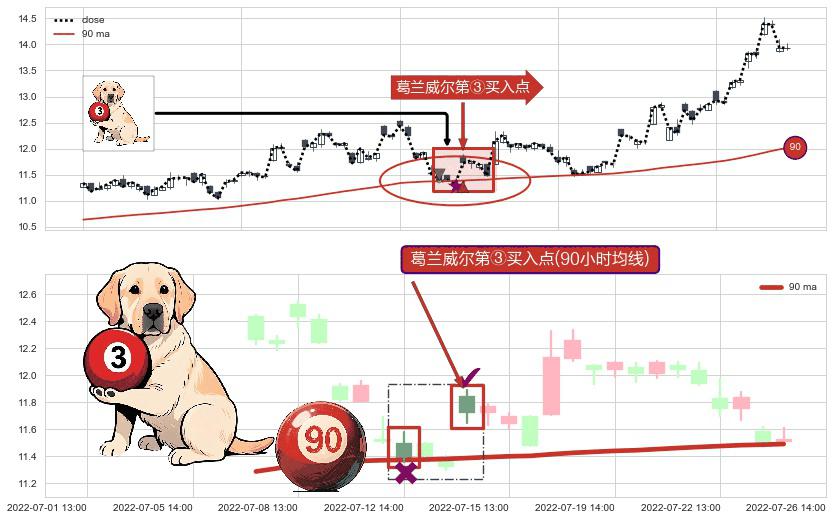 ⚀ 2022-07-14 13:00:00-小时显现 葛兰威尔均线 90小时均线 第③买入点 上升趋势的中继信号,后市看涨,买进信号