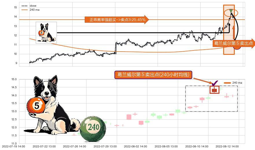 ⚀ 2022-08-11 13:00:00-小时显现 葛兰威尔均线 240小时均线 第⑤卖出点 上升趋势均值回复的短线回落信号,后市看跌,卖出信号
