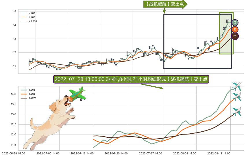⚀ 2022-07-13 14:00:00小时-2022-08-12 13:00:00小时显现 3小时-8小时-21小时均线 【战机起航】卖出点 看空信号,后市看跌,卖出