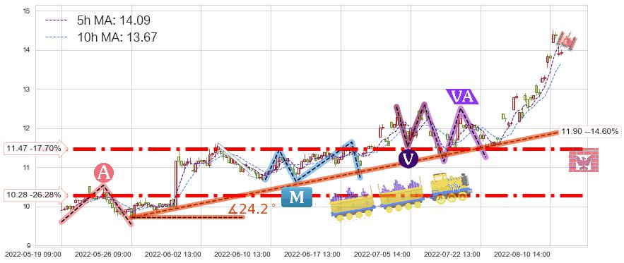 从2022-05-26 09:00至2022-08-12 14:00,共包含155个小时,阶段股价上涨38.80%,阶段股价变动位移路程比: 1 : 5,上涨趋势角度: 24.2