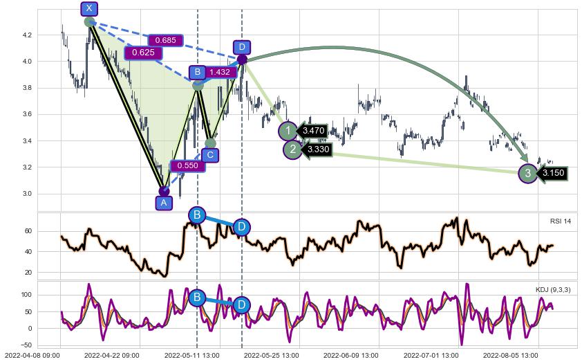 ➣ D点拟合预测价格2.644,距离最后交易收盘价格3.240相差 -18.39%