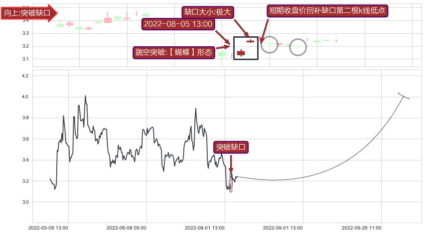 ➣ 突破缺口形成后,后续k已经超过7根,跳空突破【蝴蝶】形态关键点后, 出现【中度回踩】迹象,短期收盘价回补缺口第二根k线低点
