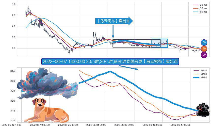 ⚀ 2022-05-25 10:00:00小时-2022-06-21 13:00:00小时显现 20小时-30小时-60小时均线 【乌云密布】卖出点 看空信号,后市看跌,卖出
