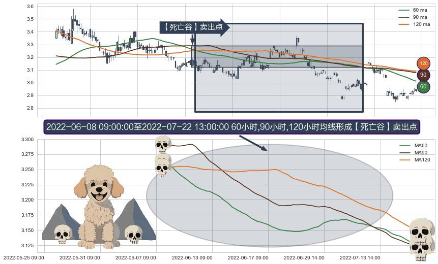 ⚀ 2022-06-08 10:00:00-小时至2022-07-22 13:00:00-小时显现 60小时-90小时-120小时均线 【死亡谷】卖出点 看空信号,后市看跌,卖出