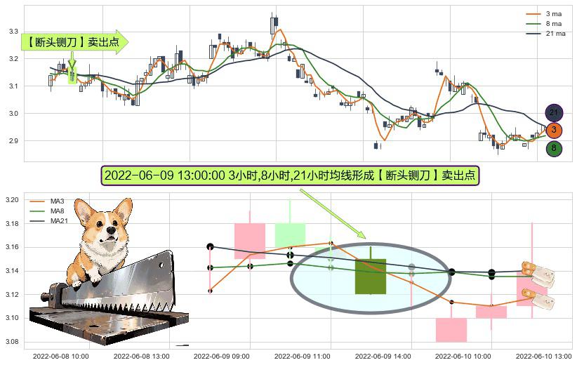 ⚀ 2022-06-09 13:00:00小时显现 3小时-8小时-21小时均线 【断头铡刀】卖出点 看空信号,后市看跌,卖出