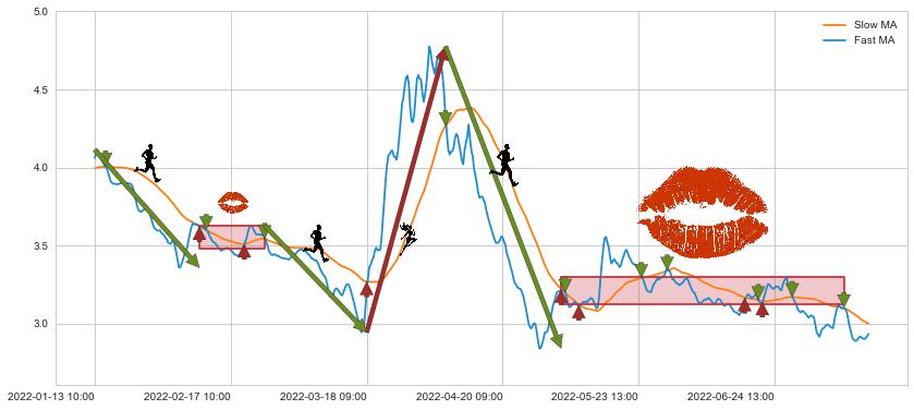 05-05 13:00至07-29 14:00 慢线与快线多次接触,存在上下穿越,有缠绕