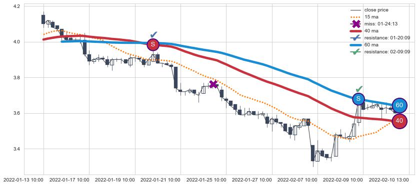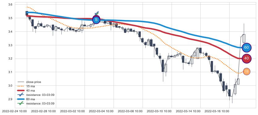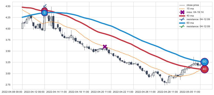⚂ 2022-06-29 13:00:00-小时均线向上突破,2022-06-30 13:00:00-小时重新下穿均线破位,均线阻力再次生效