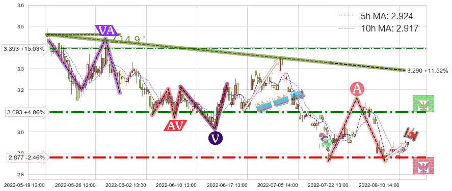 ♘ 阻力价格位3.393,可信任强度53.25%,距离最后交易2022-08-12 14:00形成的收盘价格2.950相差 +15.03%