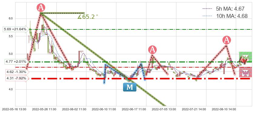♘ 阻力价格位4.77,可信任强度56.45%,距离最后交易2022-08-12 14:00形成的收盘价格4.68相差 +2.01%