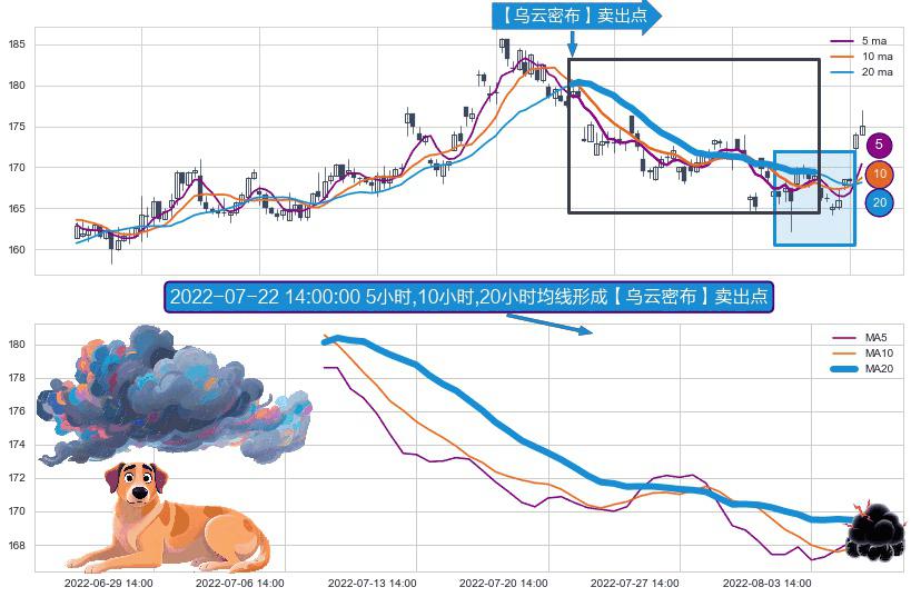 ⚀ 2022-07-08 13:00:00小时-2022-08-05 14:00:00小时显现 5小时-10小时-20小时均线 【乌云密布】卖出点 看空信号,后市看跌,卖出