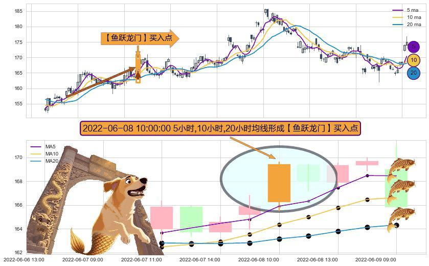 ⚀ 2022-06-08 10:00:00小时显现 5小时-10小时-20小时均线 【鱼跃龙门】买入点 看多信号,后市看涨,买入