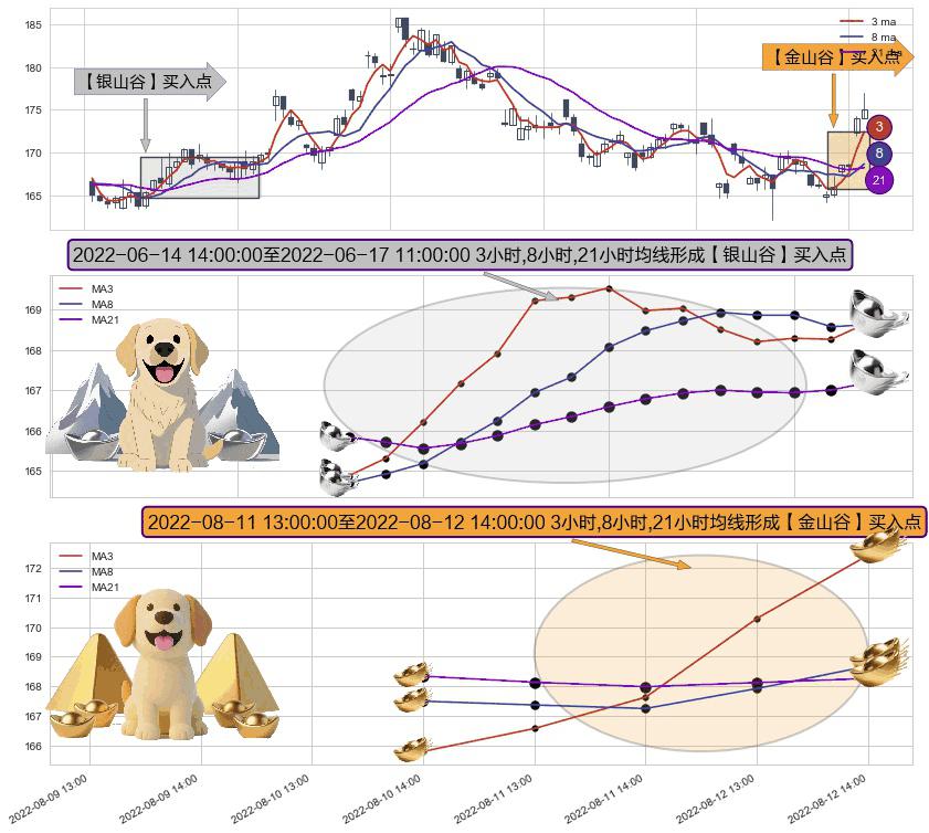 ⚀ 2022-08-11 14:00:00-小时至2022-08-12 14:00:00-小时显现 3小时-8小时-21小时均线 【金山谷】买入点 其再次确认了买入信号,可靠性更强,买入