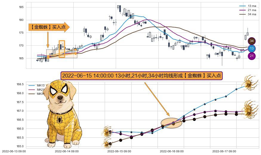 ⚀ 2022-06-15 14:00:00小时显现 13小时-21小时-34小时均线 【金蜘蛛】买入点 看多信号,后市看涨,买入