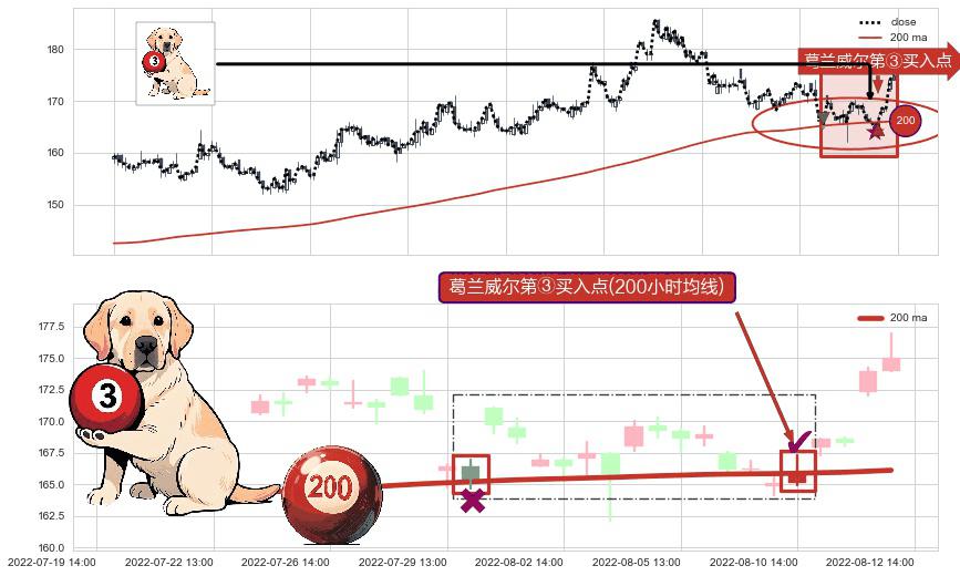 ⚀ 2022-08-10 14:00:00-小时显现 葛兰威尔均线 200小时均线 第③买入点 上升趋势的中继信号,后市看涨,买进信号
