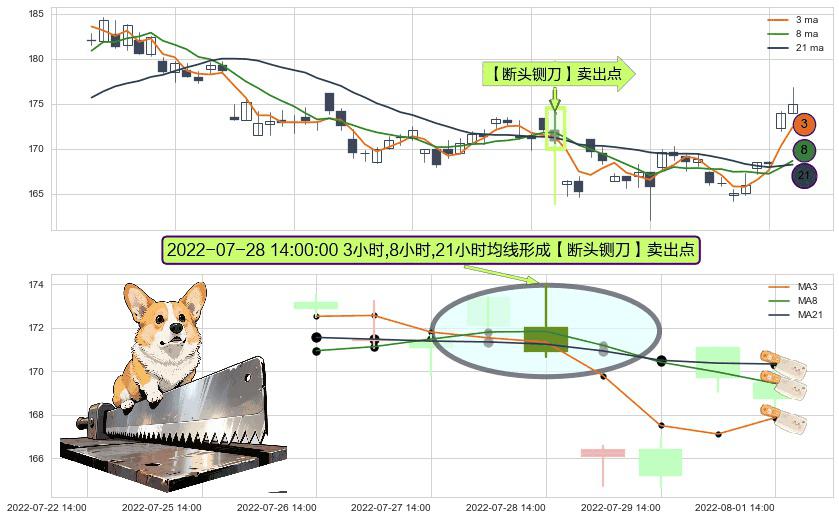 ⚀ 2022-07-28 14:00:00小时显现 3小时-8小时-21小时均线 【断头铡刀】卖出点 看空信号,后市看跌,卖出