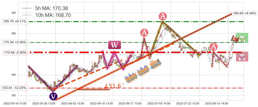 ♘ 阻力价格位175.54,可信任强度51.10%,距离最后交易2022-08-12 14:00形成的收盘价格175.01相差 +0.30%