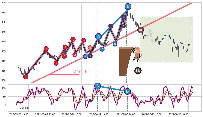 从2022-06-14 11:00至2022-07-07 13:00,共包含45个小时,阶段股价上涨8.73%,阶段股价变动位移路程比: 1 : 4,上涨趋势角度: 45.7