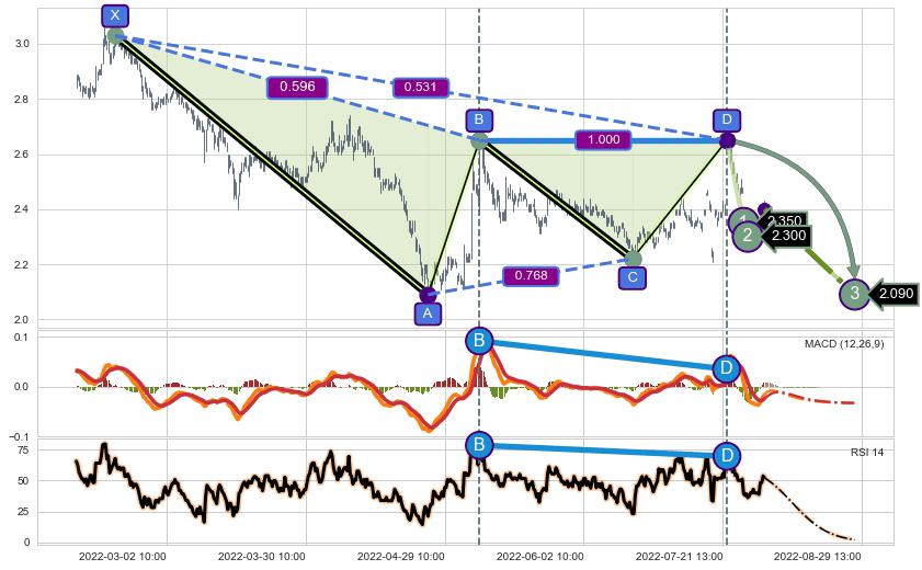 ➢ 谐波价格D点比B点高 ⤴,【MACD】指标D点比B点低 ⤵️