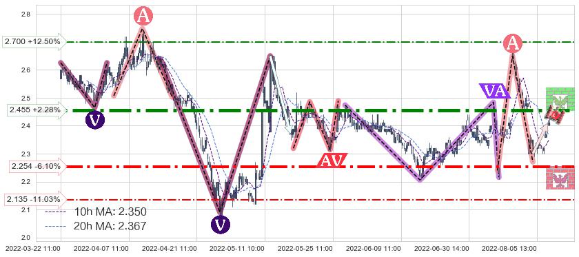 ♘ 阻力价格位2.455,可信任强度92.79%,距离最后交易2022-08-12 14:00形成的收盘价格2.400相差 +2.28%