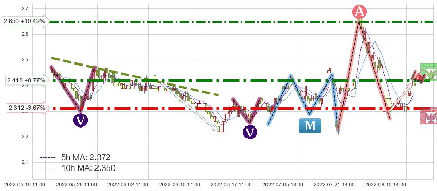♘ 阻力价格位2.418,可信任强度85.16%,距离最后交易2022-08-12 14:00形成的收盘价格2.400相差 +0.77%