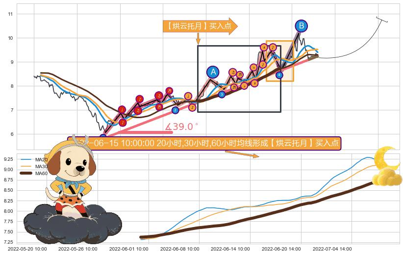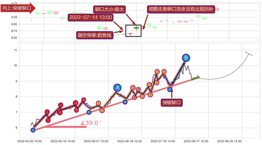 从2022-04-27 09:00至2022-08-04 14:00,共包含238个小时,阶段股价上涨44.08%,阶段股价变动位移路程比: 1 : 5,上涨趋势角度: 39.0
