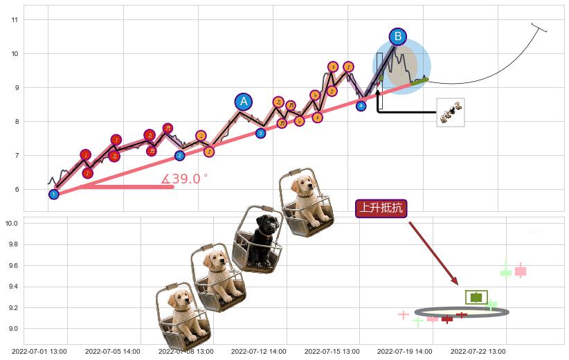 从2022-05-24 14:00至2022-07-12 13:00,共包含119个小时,阶段股价上涨19.42%,阶段股价变动位移路程比: 1 : 5,上涨趋势角度: 38.8