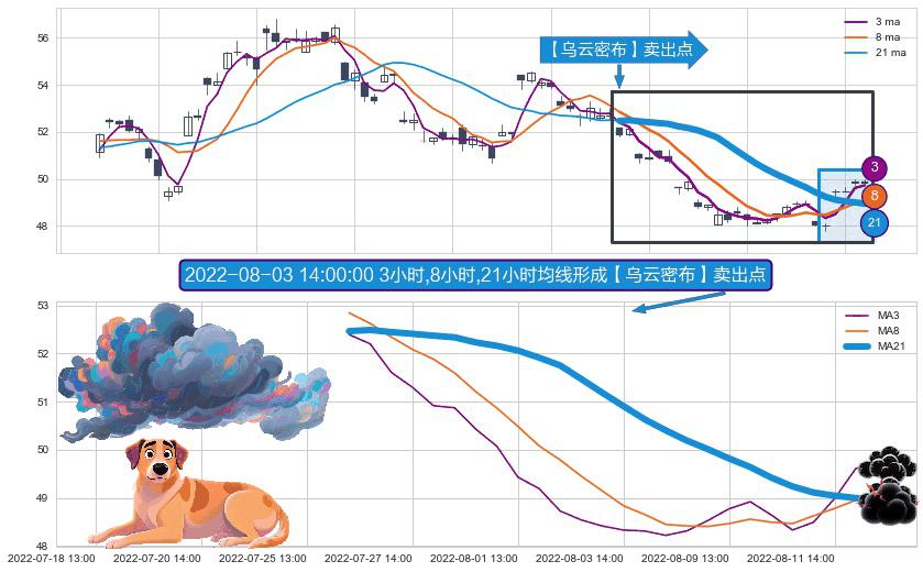 ⚀ 2022-07-26 13:00:00小时-2022-08-12 14:00:00小时显现 3小时-8小时-21小时均线 【乌云密布】卖出点 看空信号,后市看跌,卖出