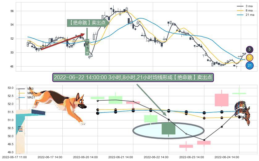 ⚀ 2022-06-22 14:00:00小时显现 3小时-8小时-21小时均线 【绝命跳】卖出点 看空信号,后市看跌,卖出