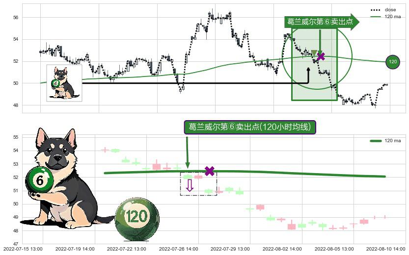 ⚀ 2022-07-26 13:00:00-小时显现 葛兰威尔均线 120小时均线 第⑥卖出点 走势反转见顶信号,后市看跌,卖出信号