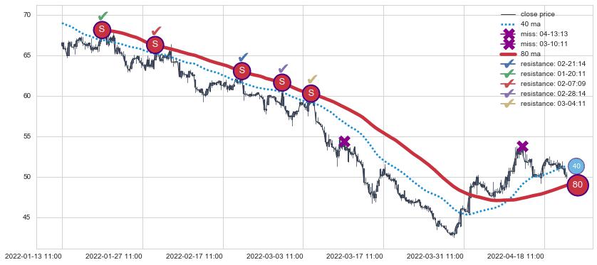 ⚅ 卖点向下突破均线后,价格走势有持续向下的迹象,但动能稍显不足,迟迟不能远离均线